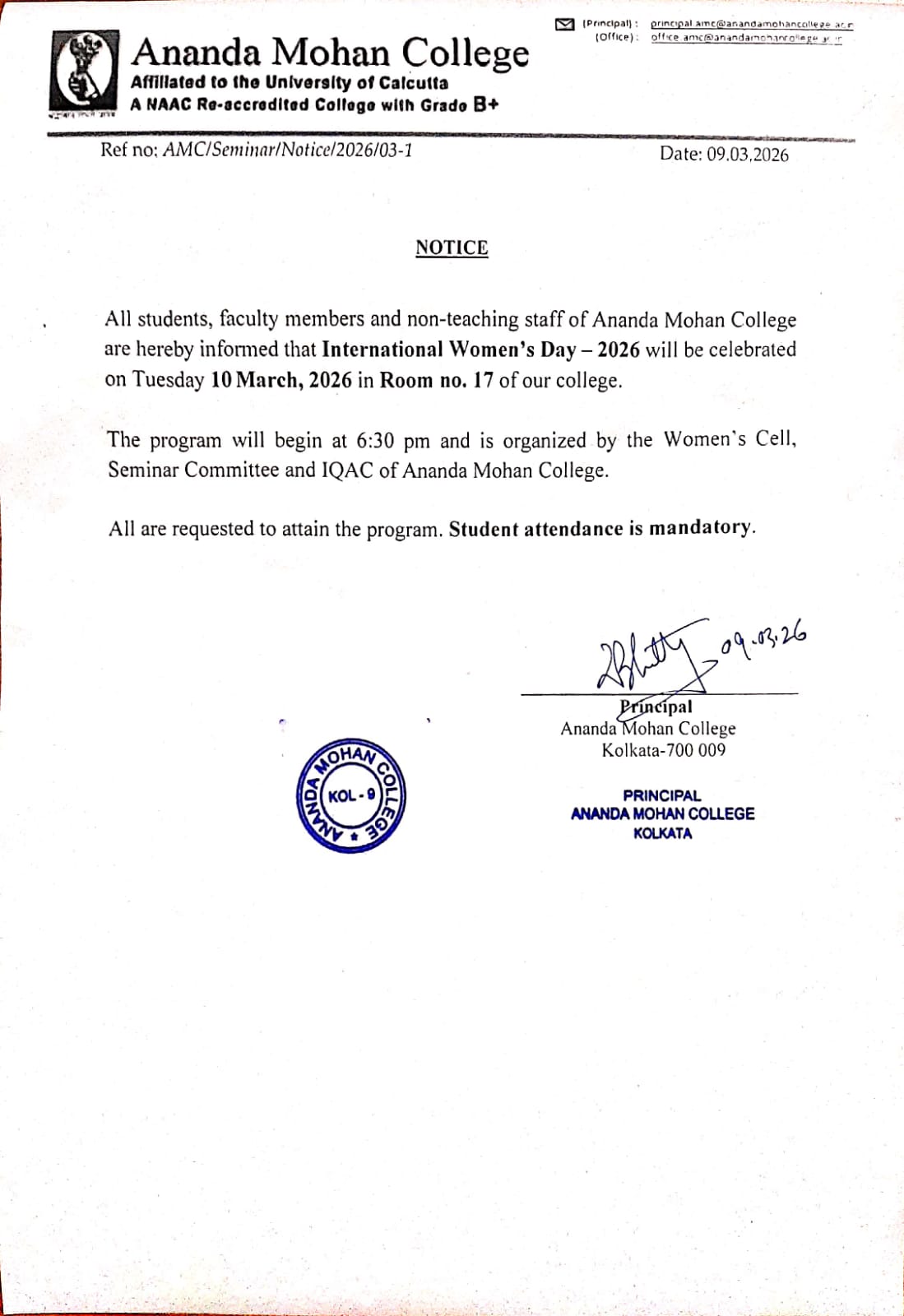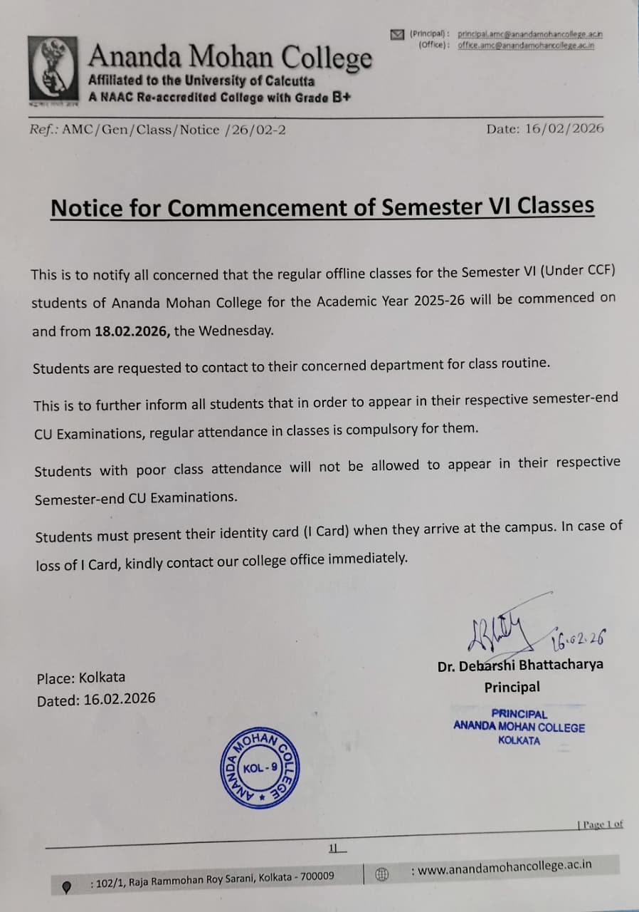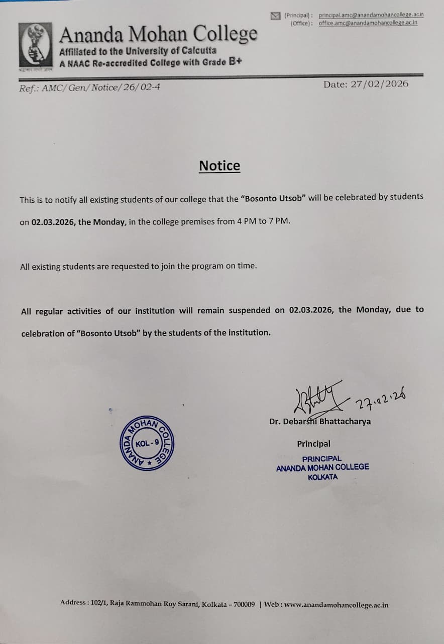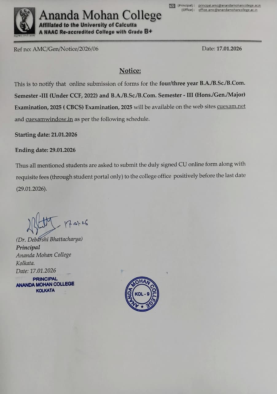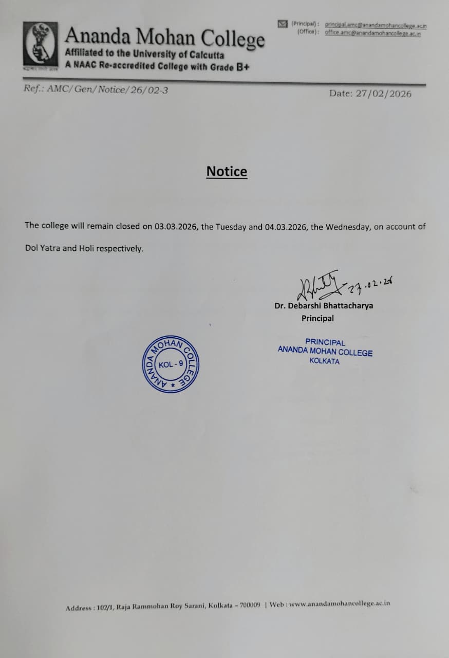 It is with great pride, I extend my warm greetings to you as President of the Governing Body of Ananda Mohan College. Our College stands as a beacon of knowledge, where innovation, critical thinking, and creativity are fostered within an environment of respect and inclusivity. Our commitment to academic excellence is coupled with an equally strong focus on the overall development of our students. We believe that education is not only about imparting knowledge but about preparing young minds to excel in an ever-evolving global landscape. We aim to develop students who are not only equipped with the tools to succeed professionally but are also empowered to become responsible, compassionate, and well-rounded individuals....