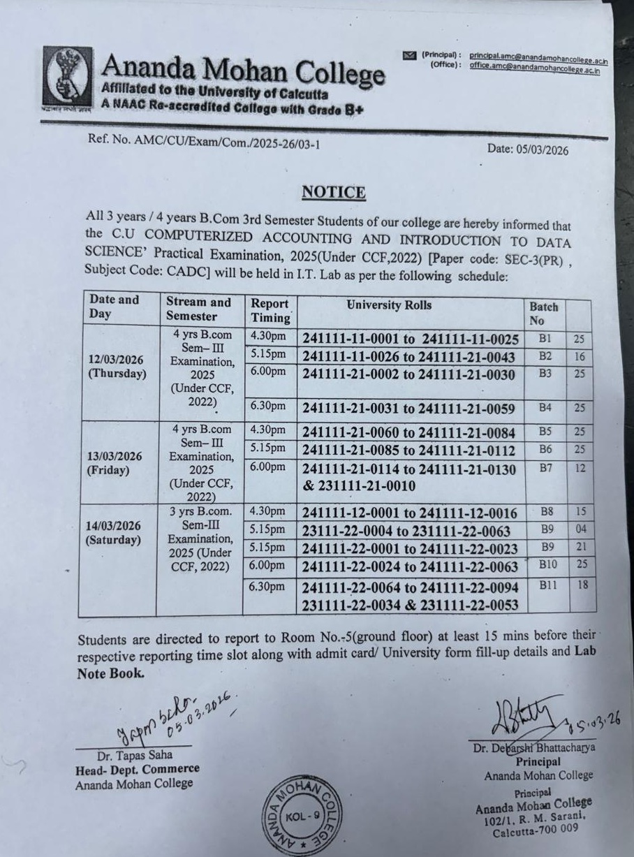 B.Com. 3rd semester students are informed that the Computerized Accounting and Introduction to Data Science Practical Examination, 2025 will be held in IT Lab from 12/03/2026 from 14/03/2026. For further details, check the notice — NOTICEÂ