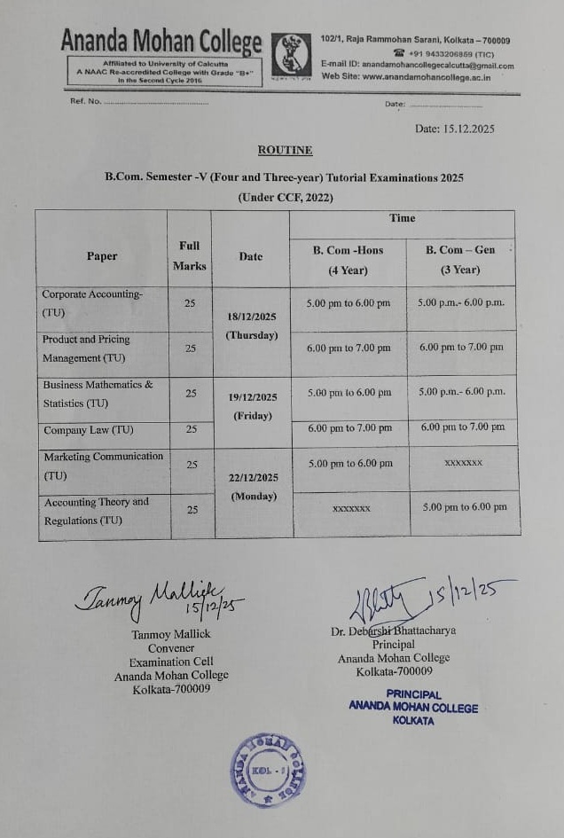 B.Com. (4 yrs/ 3 yrs) Semester-5 Tutorial Exam.-2025 will be started from 18/12/2025 (Thursday) —