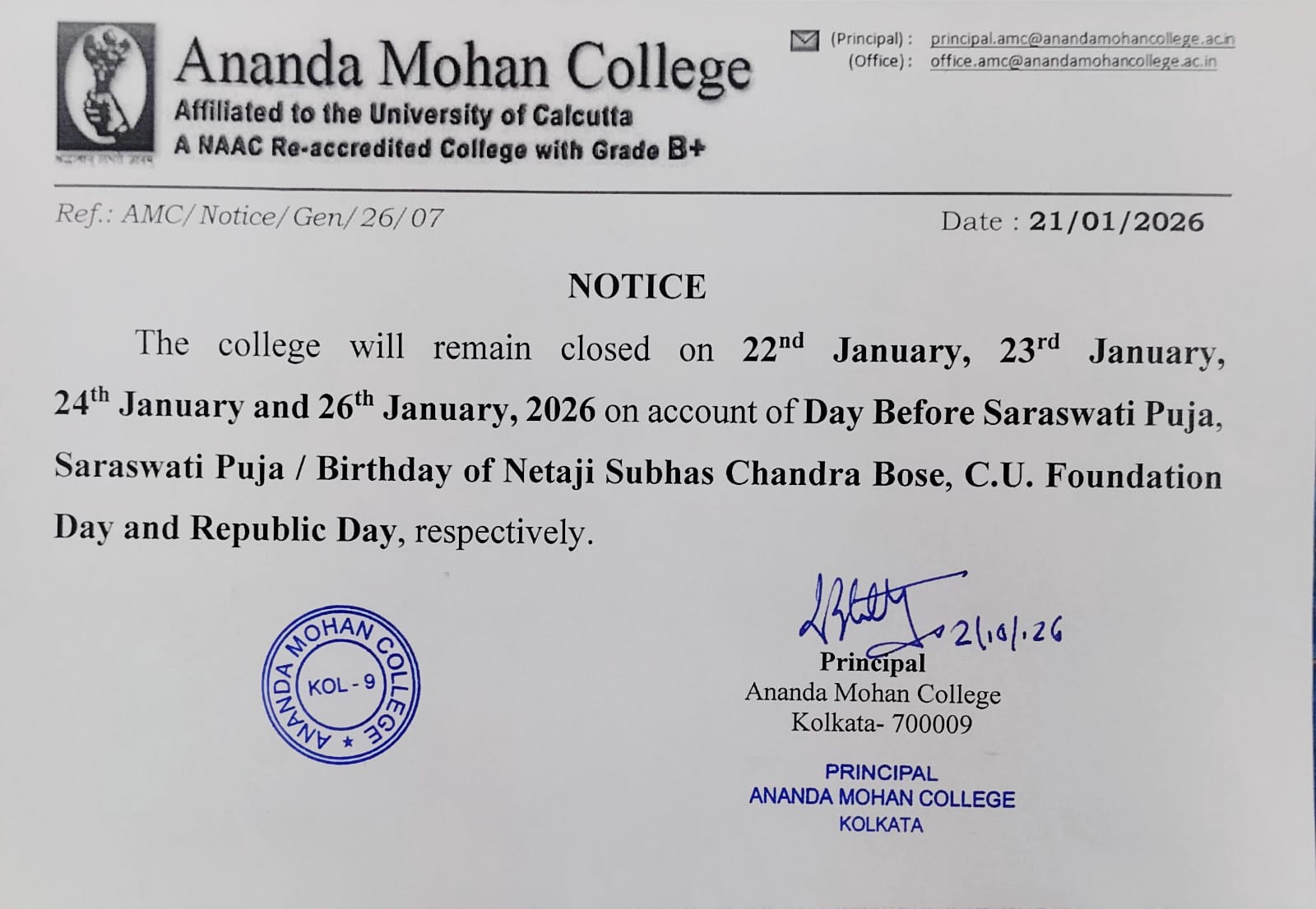 College will remain closed from 22/01/2026 to 26/01/2026