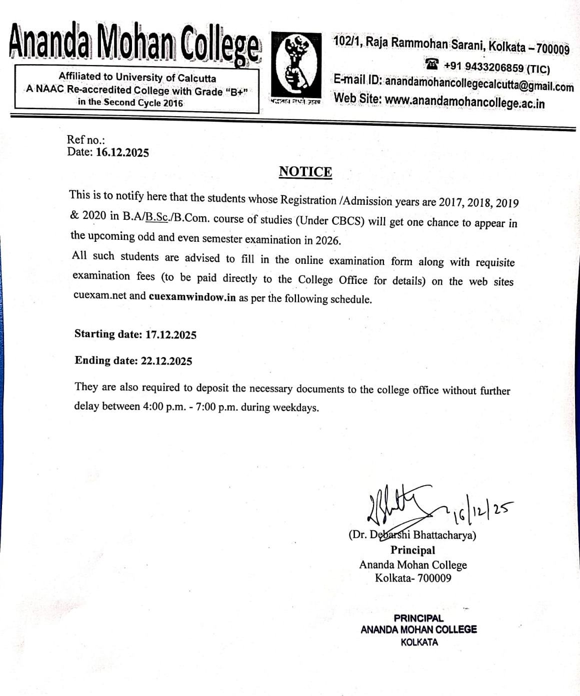 All the students of B.A./B.Sc./B.Com. (CBCS) whose registration/ admission years are 2017, 2018, 2019 & 2020 can appear for the upcoming odd and even semester examination in 2026. All such students are advised to fill in the online examination form along with requisite examination fees from 17/12/2025. For further details, check the attachment — NOTICEΒ